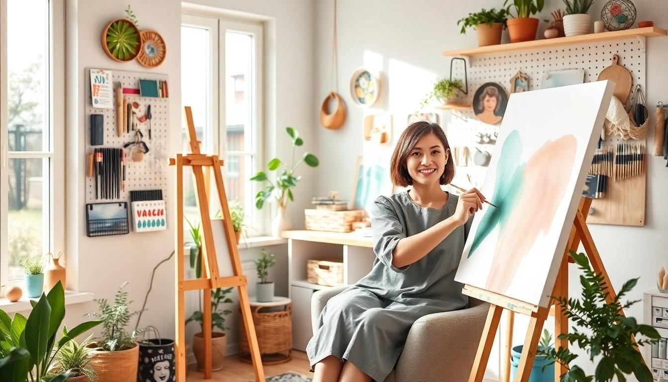 Wall-mounted pegboards create visual interest and functionality. Artists can hang tools and materials for quick access, keeping the area clutter-free. Bright colors on walls stimulate creativity, while neutral tones provide a calming backdrop.